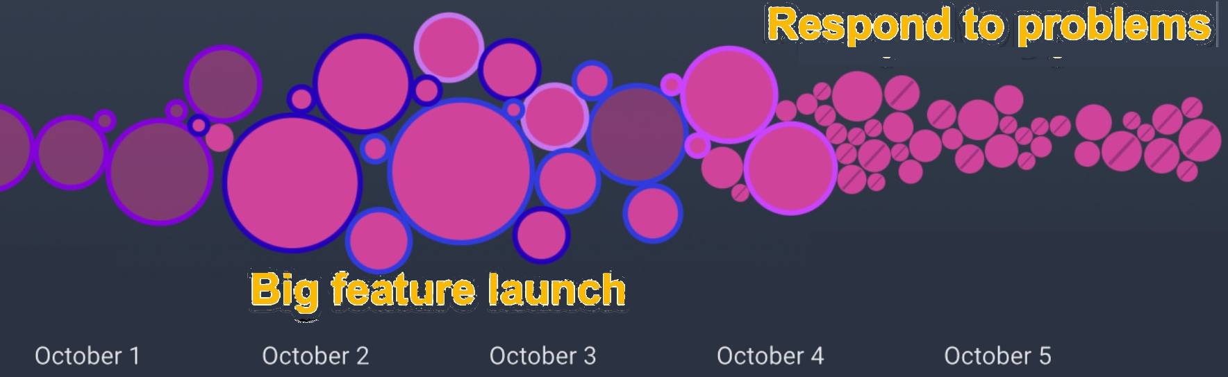 A common pattern we observe is that following a big product launch, there is often a flurry of activity in response to new exceptions or warnings that get generated once the large change meets messy production data. The post-deploy flurry tends to yield a tightly focused group of commits, because the typical bug found in the aftermath of a launch is a small oversight that can be quickly remedied.