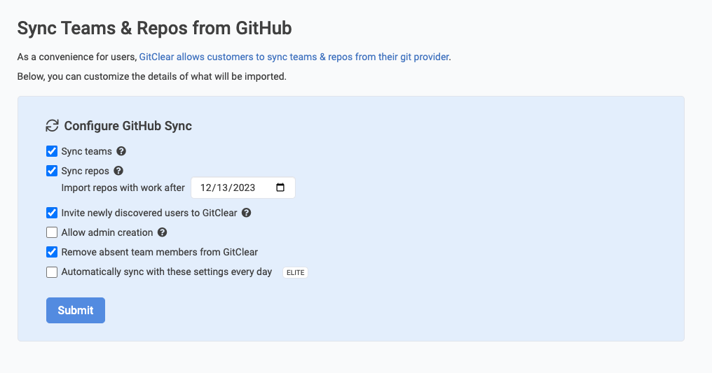 Elite subscribers can keep their GitClear teams perpetually in sync with the teams at their git host by checking this option. This benefit means that Elite subscribers only need to manage the membership of teams on one site (their git provider) instead of two (their git provider and GitClear).