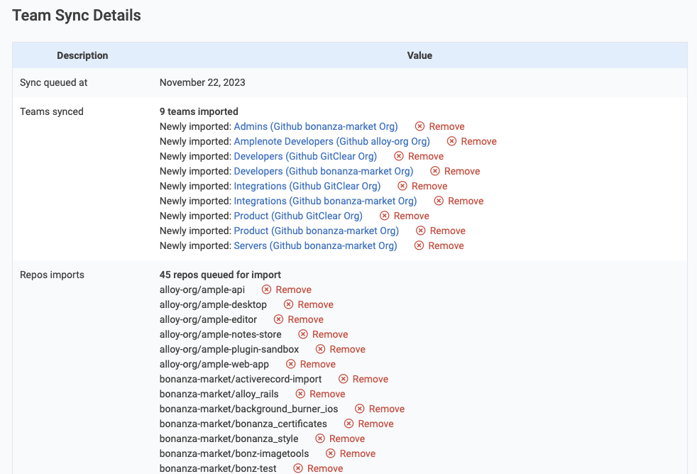 Only teams and repos that were created by this specific team sync request will be listed for removal. If you are reviewing the results of a team sync where most of the content is not new, you won't see "Remove" links next to the previously-imported content, only the newly-imported content. If you really want to delete a team or repo that is listed, you can click the link to the resource and delete it from there, or you can open the sync request in which the resource was created.