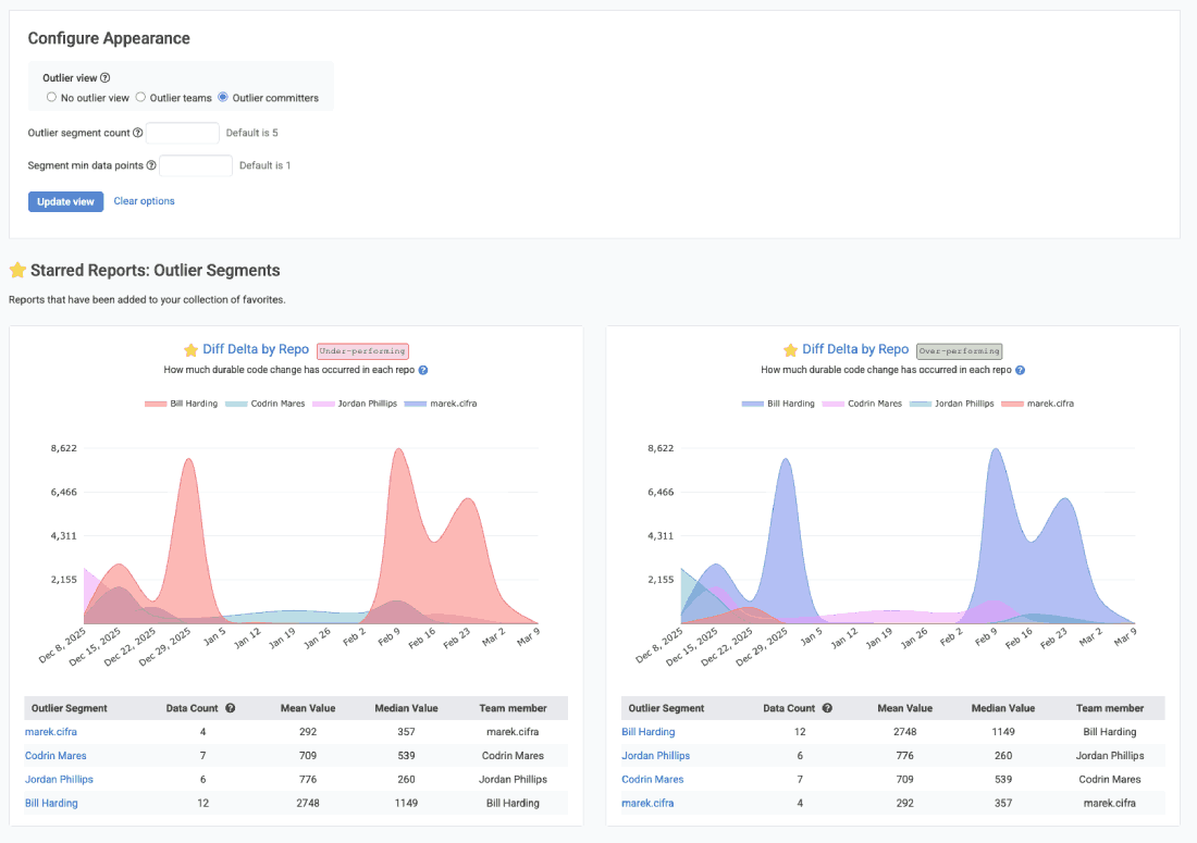 But for our true Enterprise-sized customers, with 50+ developers spread across 10+ teams, it becomes essential to zoom out. VPs and executives at large companies need to work at a many-teams scale, and that is what GitClear's "Outlier Mode" within Starred Reports can offer: