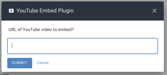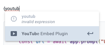const url = await app.prompt("URL of YouTube video to embed?", { inputs: [ { type: "string" } ] });